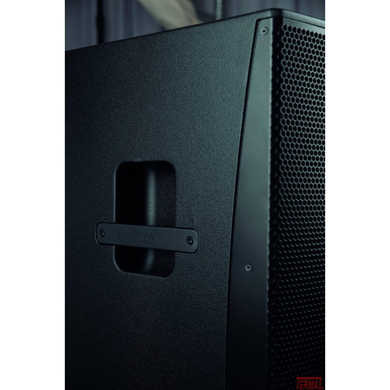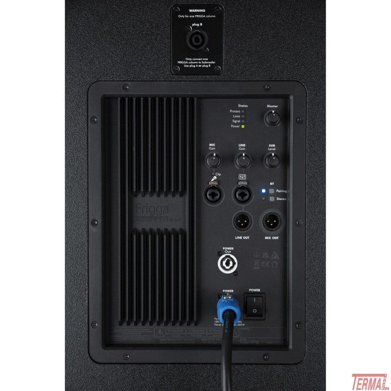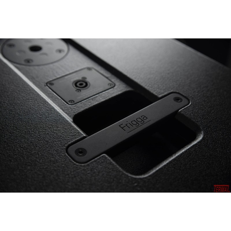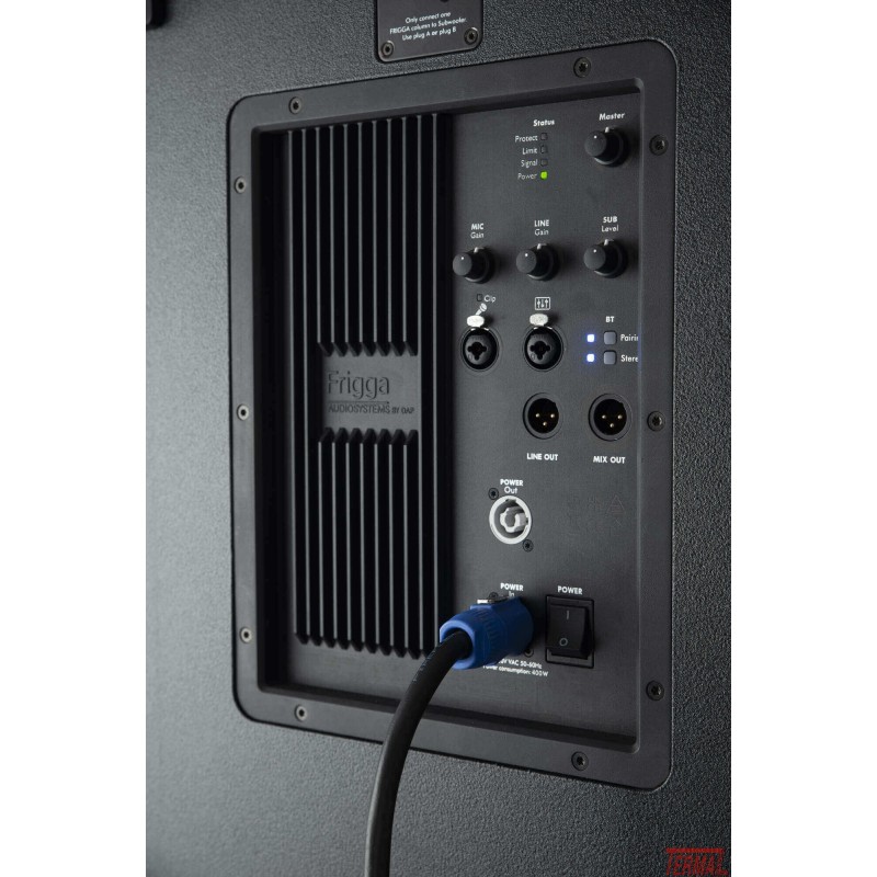 DAP Frigga je aktivni PA sistem zvočnikov primeren za kantavtorje, korporativne voditelje, mobilne DJ-je, klube in glasbene skupine. Ponuja tri vhode: vhod za mikrofon XLR z indikatorjem Gain in Clip, linijski vhod XLR s passthtrough in Bluetooth s podporo za TWS. Mešani izhod združuje vse signale. Upravljalnik nivoja SUB in glavni nivo prilagajata ravnovesje in glasnost. Statusne lučke prikazujejo stanje ojačevalnika. Frigga ima aktivni dvojni 12" sub z vgrajenim ojačevalnikom za stopni zvočnik. Stolpni zvočnik vključuje 6 x 4" neodim midrange drivers in 1,5" neodim compression driver. Vgrajeni ojačevalnik zagotavlja 1000W RMS v treh kanalih. Frigga je opremljena s kabli, montažnimi palicami in distančnikom. V črni ali beli barvi. Pri uporabi TWS signali mikrofona in linije ne prenašajo prek Bluetooth.