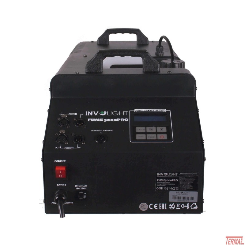 Naprava za dim ki se upravlja preko dmx, upravljalca na sami napravi ali daljinskega upravljalca. Naprava ima elektronski nadzor temperature (ETS), zaznavanje nizkega nivoja tekočine